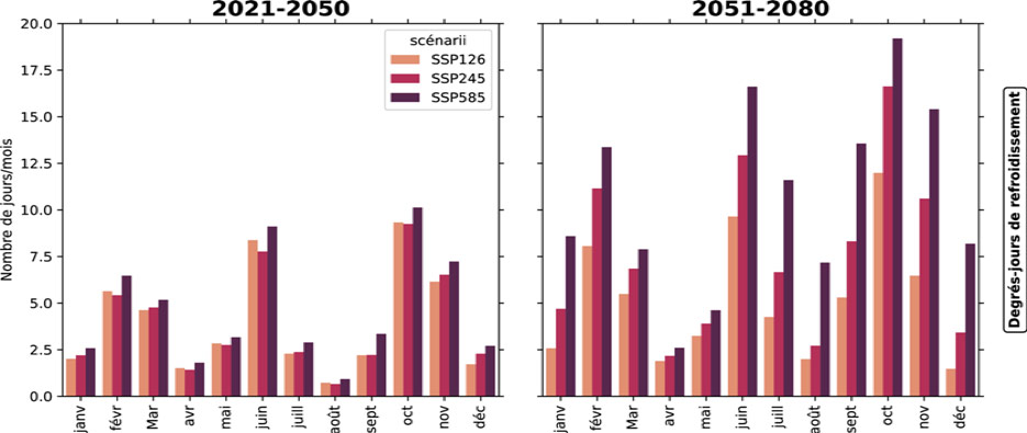 Tous les modèles s’accordent sur le signe de l’augmentation significative des degrés-jours de refroidissement au Burkina Faso. Le nombre de jours par an augmente avec le niveau du scénario et s’accélère vers la fin du siècle.