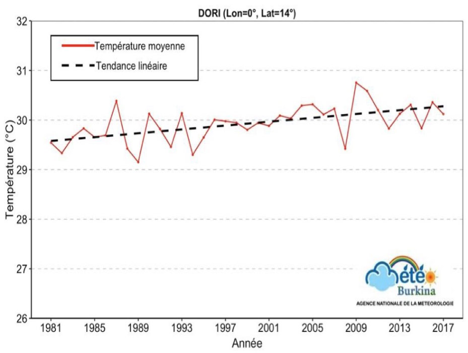 L’analyse du climat actuel montre une tendance à la hausse de la température moyenne annuelle sur les trois (03) zones climatiques avec une augmentation de 0,2 °C par décennie à Dori et 0,3 °C par décennie à Ouagadougou et à Bobo-Dioulasso.