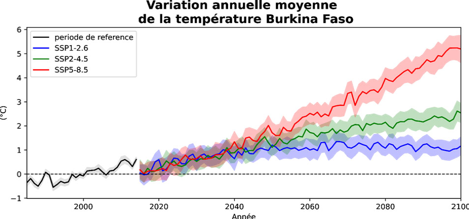 La température de l’air devrait augmenter au Burkina Faso. La moyenne d’ensemble des modèles prévoit une augmentation significative de la température de l’air . La température augmente au fur et à mesure que les scénarii climatiques passent de faibles à fortes émissions et vers la fin du siècle. Les parties Ouest et Nord du pays connaîtront un réchauffement plus important, mais le Nord aura une augmentation plus élevée. Les parties du Sahel, du Nord et du Centre-Nord devraient augmenter d’environ 1,0°C (SSP1-2.6) 1,3°C (SSP2-4.5) et 1,5°C (SSP5 -8.5) dans un proche avenir.