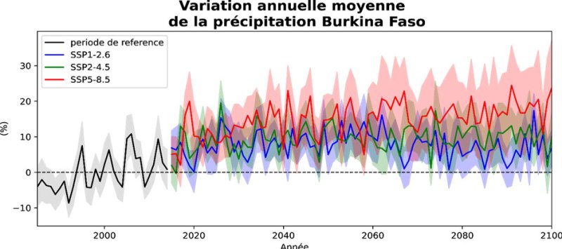 Environ 80 % des modèles prévoient une augmentation des précipitations au Burkina Faso dans tous les scénarii et périodes considérées. Cette augmentation est significative dans toutes les régions avec une probabilité de 95 %. L’augmentation est plus prononcée à la fin du siècle et dans le scénario de fortes émissions (SSP5-8.5). Ce scénario montre une augmentation de plus de 20 % surtout dans la partie Nord du pays pour la période 2051-2080. Dans le scénario optimiste (SSP1-2.6), le pays pourrait connaître une augmentation minimale d’environ 5 % pour les deux périodes.